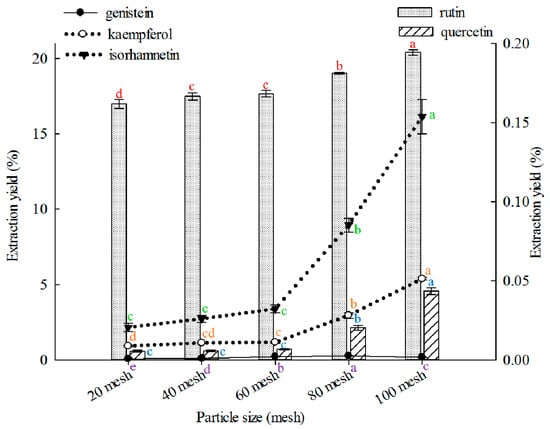 The appropriate particle size is fundamental to obtain optimal extraction, and varied particle sizes can significantly affect extraction yields [69]. In this study, 100 mesh showed better results than other particle sizes in extracting rutin, quercetin, kaempferol, and isorhamnetin (Figure 2), and 80 mesh was better than other particle sizes in extracting genistein. Effects of particle size on extraction of rutin, quercetin, genistein, kaempferol, or isorhamnetin from FSI are rarely reported.