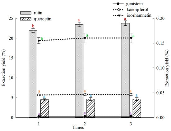 The effect of extraction frequency on the extraction yield of the five main constituents from FSI was investigated, and the results are shown in Figure 3. In this study, twice and thrice extraction showed better results in extracting rutin than single extraction. The twice extraction and thrice extraction did not differ significantly. The extraction yields of quercetin, genistein, kaempferol and isorhamnetin did not differ significantly when the extraction was performed once to thrice.