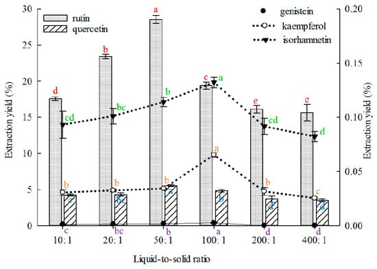 The solvent volume must be sufficient to ensure complete immersion of materials for efficient extraction. Extraction solvent deficiency can lead to incomplete extraction of ingredients, but redundant solvent may also lead to lower extraction yields and solvent waste [69]. Therefore, the liquid-to-solid ratio must be appropriate. The effect of liquid-to-solid ratio on the extraction yield of the five constituents was investigated, and the results are shown in Figure 4. The 50:1 (v/m) proportion showed better results than other liquid-to-solid ratios in extracting rutin and quercetin. The 100:1 proportions were better than other liquid-to-solid ratios in extracting genistein, kaempferol and isorhamnetin. The maximum and minimum liquid-to-solid ratios of 500:1 and 4:1, respectively, have been reported for the extraction of rutin or quercetin from FSI, but with low extraction yields [21,47].