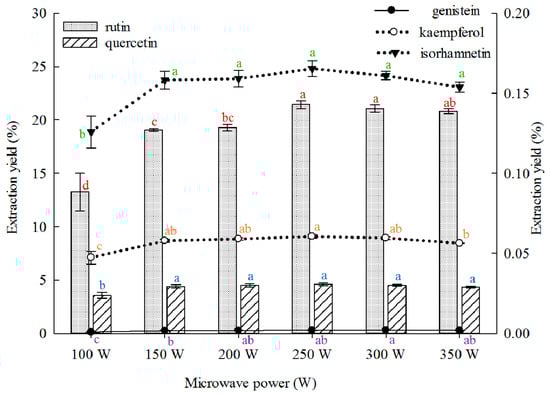Low microwave power reduces extraction yield. However, excessively high power results in energy wastage. Therefore, the optimal microwave power should be determined. The effect of microwave power on the extraction yield of the five main constituents from the FSI was investigated, and the results are shown in Figure 5. The extraction yields of rutin, quercetin, kaempferol, and isorhamnetin from the FSI evidently increased with increasing microwave power, but no increase was observed above 250 W. The extraction yield of genistein continued to increase with the microwave power and peaked when the power was 300 W. Subsequently, a reduction in yield was observed. Previous study on the effects of microwave power for rutin and quercetin extraction from FSI are available, but microwave power was high (350–480 W) and the extraction yield was low (rutin, 14.66%–21.97%; quercetin, 0.46%–0.61%) [31,36,45,47].
