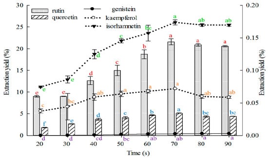 The extraction yields of rutin, quercetin, kaempferol, and isorhamnetin increased as the extraction time was prolonged from 20 s to 70 s and peaked at 70 s. However, extraction yields of genistein increased as the extraction time was increased from 20 s to 80 s and peaked at 80 and 90 s, but without a statistically significant difference. Thus, extraction time is shorter than those reported in previous reports [8,19,20,21,22,23,25,30,37,39,40,41,44,46,48,50,51,52,53,55,56,57,58].