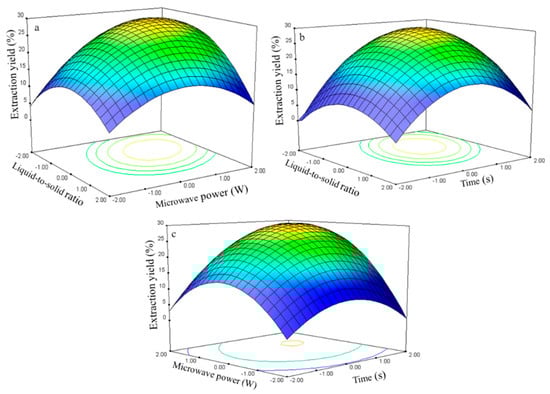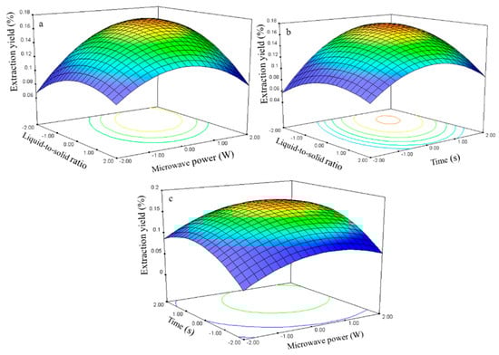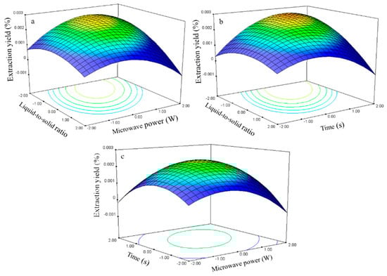 The response surface plots for the time effect on the extraction yield (Figure 9b,c) at constant microwave power and liquid-to-solid ratio show that an appropriate extraction time (75–80 s) had positive effects on the extraction yield.