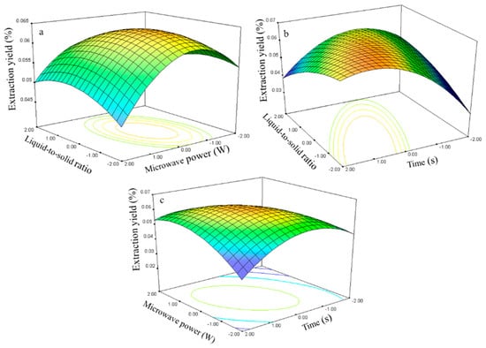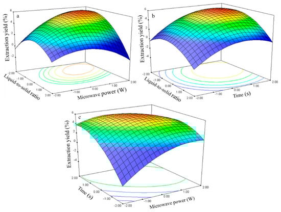 The relationship between the genistein extraction yield and the process variables is depicted in Figure 9. The liquid-to-solid ratio and microwave power effects on the extraction yield at 0 level fixed time are shown in Figure 9a. The genistein extraction yield gradually increased with the ratio and power and peaked at approximately 50–60 and 270–300 W. Further increases in these parameters resulted in decreased genistein extraction yield.