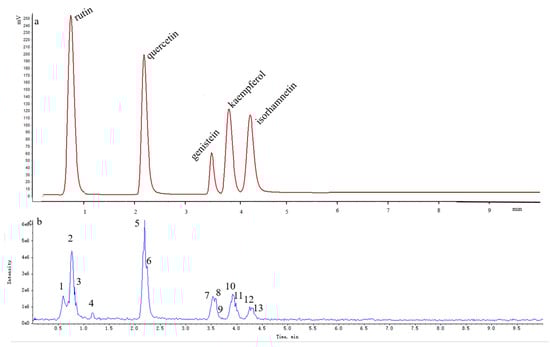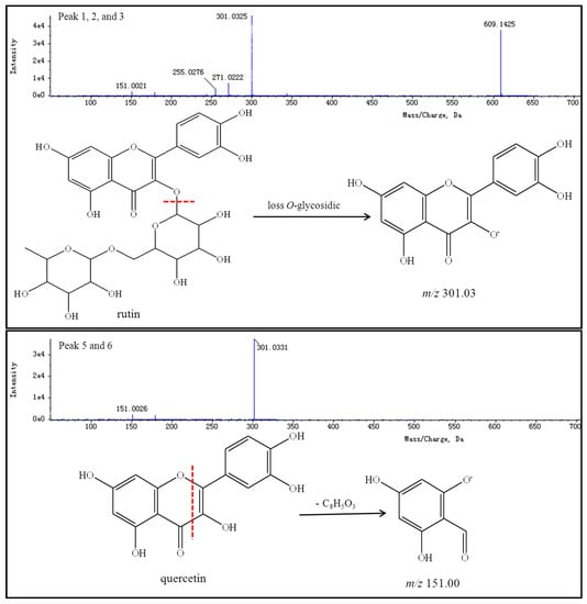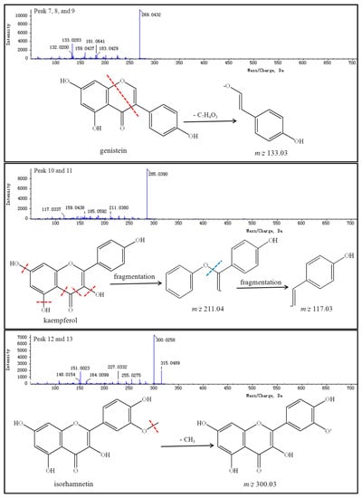Thirteen peaks, including those of rutin, quercetin, genistein, kaempferol, isorhamnetin, and their isomers, were identified using authentic standards and simultaneously quantified in the FSI extracts. The retention times, formulas, and MS/MS fragmentation data of the 13 compounds are summarized in Table 5. Possible structures and fragmentation schemes are shown in Figure 13; this information was deduced by carefully studying the MS and MS/MS spectral data of each compound and comparing findings with literature values. Peaks 1–3 reveal a group of isomers with a molecular weight of 610 and chemical formula of C27H30O16. The MS2 spectra of compounds 1–3 showed that the most abundant fragment peak at m/z 301.03 may be attributed to elimination of O-glycosidic groups from the precursor ion at m/z 609.14. Peaks 1–3 were unambiguously identified as rutin (including its isomers) by comparison with literature values [92,96].