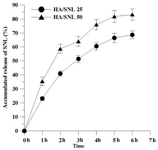 In vitro release profiles of SNL from HA/SNL25 and HA/SNL50 aggregates in PBS (pH 7.4).