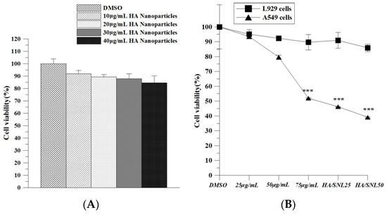 Cytotoxicity of HA nanoparticles, SNL and HA/SNL aggregates on L929 cells and A549 cells. (A) Viabilities of A549 cells treated with various HA nanoparticles concentrations; (B) Cell viability dose-response curves for L929 cells and A549 cells treated with SNL and HA/SNL aggregates over 24 h. The significant differences are based on comparisons with the L929 cells and A549 cells. *** p < 0.001.