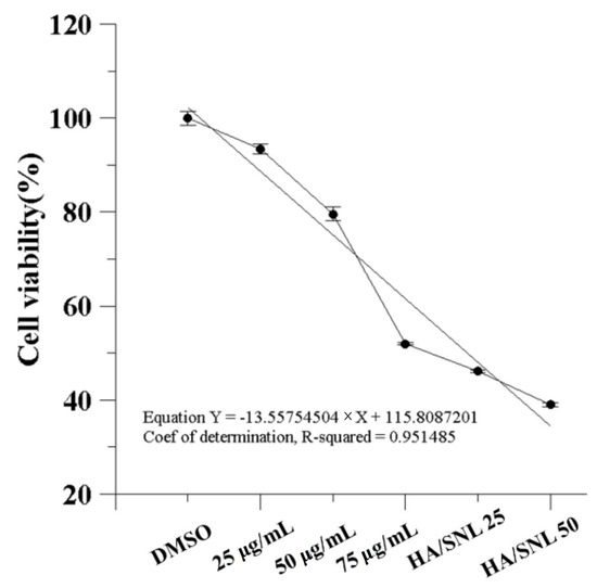 A carcinoma cell line A549 was utilized in this study. A549 cells were suspended at a final concentration of 4 × 103 cells/mL and seeded in 96-well plates. Various SNL concentrations (25, 50, and 75 µg/mL) and HA/SNL aggregates (25 and 50 µg/mL SNL) solutions were added to each well in triplicates. After 24 and 48 h of incubation, cell viability was determined through a 3-(4,5-dimethylthiazol-2-yl)-2,5-diphenyltetrazolium bromide (MTT) assay. After exposure to the aforementioned SNL and HA/SNL aggregate treatments at a predetermined time interval, 20 mL of MTT solution was added and the cells were incubated for an additional 3 h. The formazan precipitate was dissolved in 200 mL of DMSO, and the solution was vigorously mixed to dissolve the reacted dye. The absorbance of each well was read on a multiplate reader (Thermo Scientific, Waltham, MA, USA) at 570 nm; wells filled only with culture medium were used for calibration. Cells grown in a medium containing an equivalent amount of DMSO served as control. The cell viability was also examined using a live/dead cell assay (Invitrogen, Cambridge, UK).