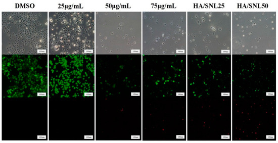 A live/dead cell assay clarified cell viability after treatments with SNL and HA/SNL aggregates. Figure 6 shows viable (green) and dead (red) A549 cells after a 24-h treatment with SNL and HA/SNL aggregates. A549 cells treated with DMSO and 25 µg/mL SNL exhibited no evident dead cells; however, dead cells appeared at high SNL concentrations. The higher amount of dead cells in the HA/SNL aggregate groups indicates that the aggregates induced more apoptosis.