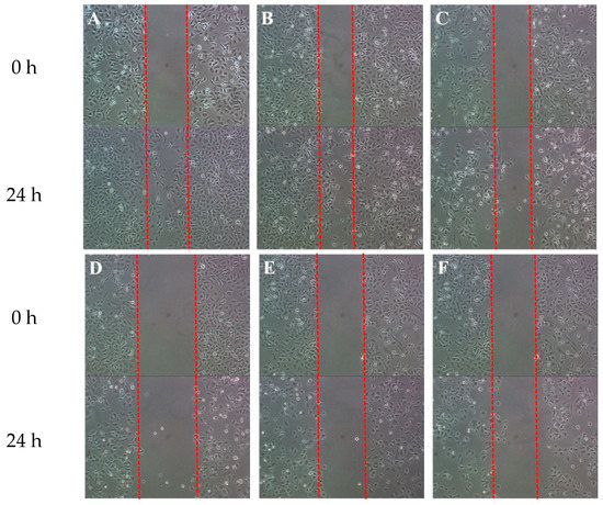 Wound healing assay of A549 cells treated with (A) DMSO, control group; (B) SNL 25 µg/mL; (C) SNL 50 µg/mL; (D) SNL 75 µg/mL; (E) HA/SNL aggregates 25; and (F) HA/SNL aggregates 50.