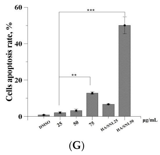 Annexin V-FITC/PI-based apoptosis profiles of A549 cells after a 24-h SNL and HA/SNL aggregates treatment. (A) DMSO; (B) 25 µg/mL; (C) 50 µg/mL; (D) 75 µg/mL; (E) HA/SNL 25; (F) HA/SNL 50; and (G) total apoptotic rate of cells treated with DMSO, pure SNL, and HA/SNL aggregates (sum of early apoptosis and late apoptosis). Red: live cells, green: apoptotic cells, blue: background (** p < 0.01, *** p < 0.001).