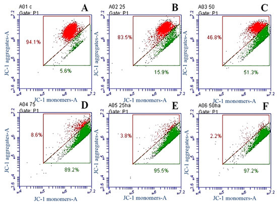 ΔΨm was calculated to confirm whether mitochondria-related apoptosis occurred because of SNL or HA/SNL aggregate treatments. A549 cells showed an increase in apoptosis after treatments with 25 and 50 µg/mL SNL (Figure 9B,C, respectively). A considerable increase in apoptosis was observed for 75 µg/mL SNL and HA/SNL aggregate groups (Figure 9D–F), where the HA/SNL 50 treatment caused approximately 97.2% apoptosis. Results suggest that HA/SNL aggregates with less SNL concentrations caused a ΔΨm loss nearly identical to that observed in cells treated with high SNL doses and significantly differed from that in the other groups (Figure 9G).