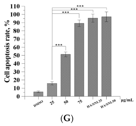 JC-1 staining-based apoptosis profile of A549 cells after a 24-h SNL and HA/SNL aggregates treatment. (A) DMSO;(B) 25 µg/mL; (C) 50 µg/mL; (D) 75 µg/mL; (E) HA/SNL 25; (F) HA/SNL 50; and (G) the total apoptotic rate of cells treated with DMSO, pure SNL, and HA/SNL aggregates (sum of early apoptosis and late apoptosis). Red: live cells, green: apoptotic cells (*** p < 0.001).