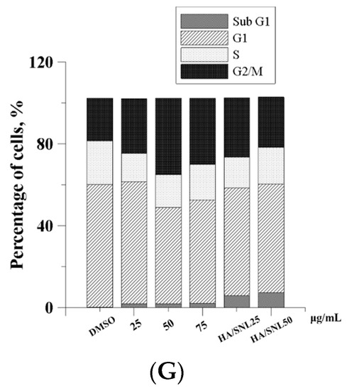 PI staining-based cell cycle analysis of A549 cells treated with DMSO, SNL, and HA/SNL aggregates. (A) DMSO; (B) 25 µg/mL; (C) 50 µg/mL; (D) 75 µg/mL; (E) HA/SNL 25; (F) HA/SNL 50; and (G) a summarized cell distribution representing mean ± SE (see Table 2).