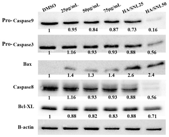 To investigate whether the observed apoptosis involved caspase activation, a western blot analysis was performed on cell extracts collected after the treatments (Figure 11). Levels of apoptosis-related proteins, pro-caspase-3, -8, and -9, Bax, and Bcl-xL, expressed in A549 cells were evaluated through western blot analyses. Caspases-3, -8, and -9 are situated at pivotal junctions in the apoptotic pathways. A 12-h incubation with HA/SNL aggregates reduced protein levels of pro-caspase-3, -8, and -9, and the antiapoptotic factor Bcl-xL, indicating that HA/SNL aggregates suppress A549 cell proliferation through apoptosis. The level of Bax (mitochondria-related apoptotic marker) increased in HA/SNL aggregate groups. These results suggest that HA/SNL aggregates induce apoptosis via the mitochondria-related apoptotic pathway. The western blot analysis of HA/SNL aggregate groups showed considerable decreases in pro-caspase-3, -8, and -9, and Bcl-xL levels and a high Bax level compared with those observed for 25, 50, and 75 µg/mL SNL. The aforementioned increases and decrease reveal that the increasing SNL concentration is involved in elevated apoptosis induction.