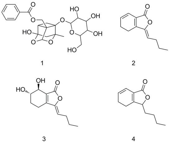 Chemical structure of paeoniflorin (1), ligustilide (2), senkyunolide I (3) and senkyunolide A (4).