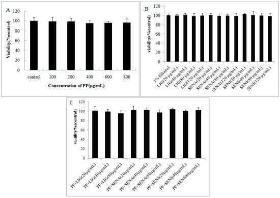 Cytotoxicity of paeoniflorin (PF) and its combination determined by 3-(4,5-dimethylthiazol-2-yl)-2,5-diphenyltetrazolium bromide (MTT) test on MDCK-MDR1 cells: (A) cytotoxicity of PF; (B) cytotoxicity of LIG, SENI and SENA; and (C) cytotoxicity of 400 µg/mL PF combined with LIG, SENI and SENA. Date are expressed as mean ±standard deviation (SD) (n = 6).