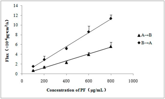 Various concentrations of PF transports were tested across MDCK-MDR1 (Table 1). In general, drugs with high Papp (>1 × 10−5 cm/s) can be well-absorbed, while those with low Papp (<1 × 10−6 cm/s) are poorly absorbed [29]. The Papp (A→B) of PF between 0.587 and 0.705 × 10−6 cm/s in MDCK-MDR1 cells showed that it is relatively poorly absorbed. The Papp of PF in A→B direction did not differ significantly (Table 1), and the fluxes of PF were linearly associated with the concentration (Figure 3), which indicated that the transport of PF was concentration dependent, not saturable and mainly passive transport. The linear equation from apical side to basolateral side was y = 0.007x − 0.117 (r = 0.9945, n = 3), and the linear equation from basolateral side to apical side was y = 0.014x + 0.022 (r = 0.9975, n = 3), where y is the flux of PF and x is the concentration of PF. The B→A/A→B permeability ER of PF was more than 2 in the MDCK-MDR1 cells, which indicated that the transport mechanism of PF might be passive diffusion as the dominating process with the active transportation mediated mechanism involved.