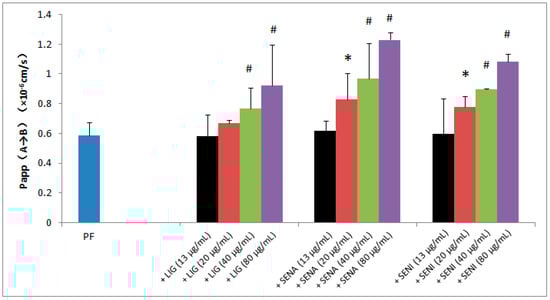 Effects of LIG, SENA and SENI on the transport of PF in MDCK-MDR1 cells. Papp, permeability; A, apical side; B, basolateral side. Values are mean ± SD (n = 3). Differs from PF (400 μg/mL): * p < 0.05, # p < 0.01.