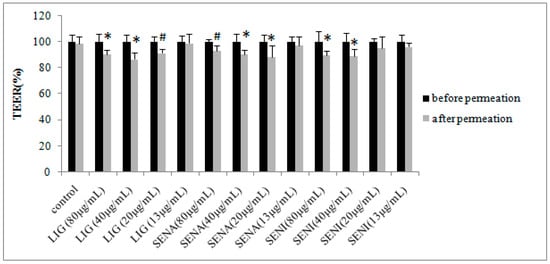 Transepithelial electrical resistance (TEER) of the monolayers was measured with the EVOM instrument (Millipore Corporation). The TEER of untreated cells and cells treated with LIG, SENI and SENA was determined in HBSS before and after the experiment. The measured TEER before the experiment was set as 100% and all other values were calculated according to this.
