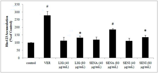 Rho 123 efflux assay was used to measure the activity of P-gp in MDCK-MDR1 cells according to previous methods [39]. In total, 5 × 105 cells (1 mL) grown to confluency in a heparinized eppendorf (EP) tube were treated with 20, 40 and 80 µg/mL of LIG, SENI, or SENA, or with 100 µmol/L verapamil, for 1 h, and subsequently incubated in 5 µmol/L rhodamine123 for 1 h. After incubation with rhodamine 123, cells were washed with ice-cold HBSS for three times and solubilized in 0.5 mL n-butyl alcohol. Fluorescence of rhodamine 123 was measured with emission wavelength at 535 nm and excitation wavelength at 485 nm using a fluorescence spectrophotometer (Victor, PerkinElmer, Waltham, MA, USA). Each experiment was repeated at least three times to ensure uptake and consistency and reproducibility of the experiments.