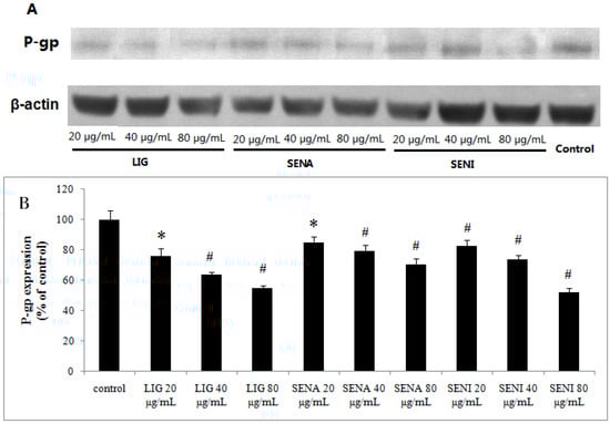 Effects of LIG, SENA and SENI on P-gp expression in MDCK-MDR1 cells: (A) representative P-gp expression by Western blot on MDCK-MDR1 treated with different concentration of LIG, SENA and SENI; and (B) quantitative data of P-gp expression. Values are mean ± SD (n = 3). Differs from control group: * p <0.05, # p < 0.01.