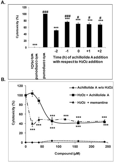 Protective effect of achillolide A on astrocyte cell death induced by H2O2. (A) Achillolide A (80 μM) was added to astrocytes before (−2 h, −1 h) concomitant (0) or after (1 h, 2 h) the addition of H2O2 (175 μM). Cytotoxicity was measured 20 h later by the levels of LDH in the conditioned media. Results are means ± SEM of two experiments (n = 8). # p < 0.05, ### p < 0.001, compared to cells that were preincubated with achillolide A before treatment with H2O2. *** p < 0.001, compared to cells that were treated with H2O2 only; (B) Astrocytes were pretreated with different concentrations of achillolide A, or memantine (as a control drug). H2O2 was added 2 h after the addition of compounds and cell death was determined 20 h later by the LDH method. The results are means ± SEM of two experiments (n = 7). *** p < 0.001, compared to cells that were treated with H2O2 only.
