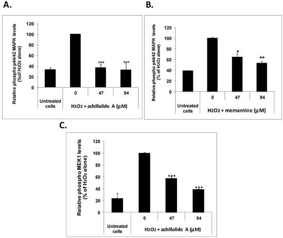 Inhibitory effect of achillolide A on H2O2-induced phosphorylation of p44/42 MAPK and MEK1 in astrocytes. Astrocytes were treated with 175 μM of H2O2 for 40 min following preincubation with achillolide A or memantine for 2 h. The levels of phosphorylated and total p44/42 MAPK (A,B) and phosphorylated and total MEK1 (C) were measured by ELISA. Relative phospho MAPK levels were calculated from the ratio: phospho MAPK levels/total MAPK levels the results are means ± SEM of two experiments (n = 4). * p < 0.05; ** p < 0.01; *** p < 0.001.