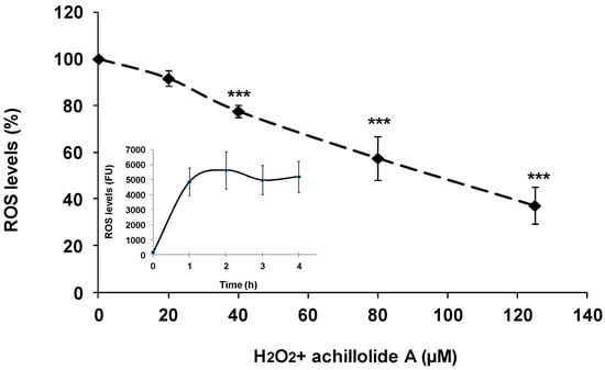 Achillolide A attenuates H2O2-induced ROS levels in astrocytes. Astrocytes were preloaded with DCF-DA for 30 min and washed. Preloaded astrocytes were then preincubated for 2 h with various concentrations of achillolide A. H2O2 (175 μM) was added to the culture and the fluorescence intensity representing ROS levels was measured 1 h later. The results represent means ± SEM of two separate experiments (n = 8). *** p < 0.001. Insert: ROS levels of cells that were treated with 175 μM H2O2 were measured at the indicated time points.