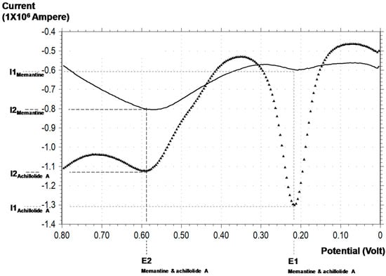 In the present study, we used the DPV approach to analyze the total reducing capacities (i.e., the antioxidant capacities) of achillolide A and memantine. As the DPV analysis was done in the absence of astrocytes, the concentrations of achillolide A and memantine (250 μM) were chosen to allow easy demonstration of the antioxidant capacity. Voltammetry analysis results include peaks for which the electric potential (x-axis) value corresponds to the nature of the antioxidant and the current (y-axis) value corresponds to its concentration in the tested sample. A smaller electric potential indicates a more powerful antioxidant that can reduce at a lower electric potential. A higher value for the current indicates a larger amount of the antioxidant [52].