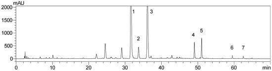 HPLC profile of the ethyl acetate extract of C. aurantium dried immature fruits and compound-identified peaks: naringin (1); hesperidin (2); neohesperidin (3); naringenin (4); hesperetin (5); nobiletin (6); and tangeretin (7).