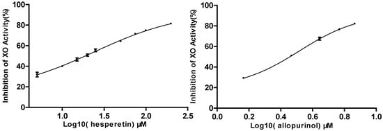 Concentration-dependent inhibition of XO activity by hesperetin and allopurinol. Data represent mean ± standard deviation (S.D.) of triplicate experiments.