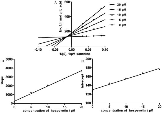 Inhibition kinetics of xanthine oxidase by hesperetin. (A) Lineweaver-Burk plots in the absence or at the different concentrations of hesperetin. Each point is the average value from triplicate experiments. Secondary plots to calculate the inhibition constants are shown in (B) (Ki) and (C) (KI).