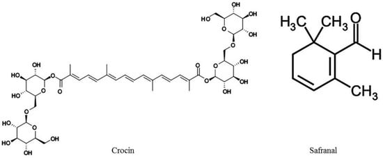- Halatei, B.S.; Khosravi, M.; Sahrei, H.; Golmanesch, L.; Zardooz, H.; Jalili, C.; Ghoshoomi, H. Saffron (Crocus sativus) acueous extract and its constituent crocin reduces stress-induced anorexia in mice. Phytother. Res. 2011, 25, 1833–1838. [Google Scholar] [CrossRef] [PubMed]