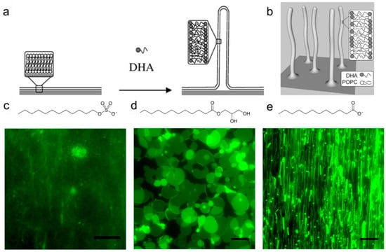 (a) Treatment of supported lipid bilayers with docosahexaenoic acid (DHA) induces three-dimensional membrane morphological changes; (b) Schematic of DHA-induced, elongated lipid structures on top of supported lipid bilayer. Top-down view of changes in the morphology of supported lipid bilayers, including (c) membrane solubilization (SDS treatment); (d) membrane budding (GML treatment); and (e) membrane fibrillation (LA treatment). The scale bars in all micrographs are 20 μm. Reproduced with permission from Refs. [46,47].
