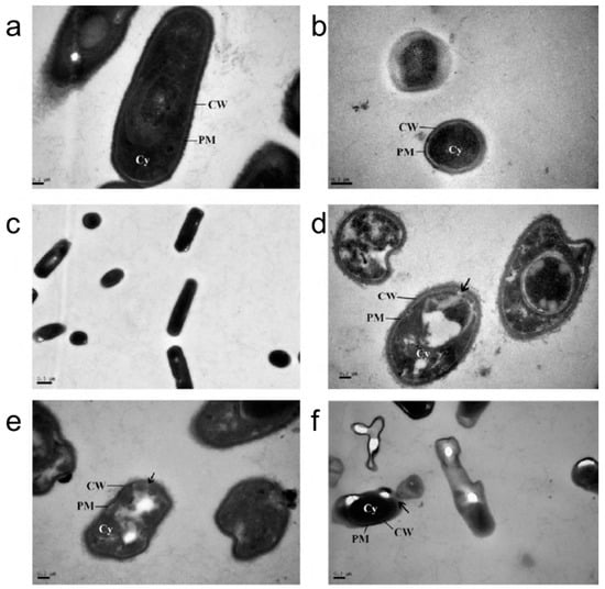 Transmission electron microscopy micrographs of untreated (a) E. coli; (b) S. aureus; and (c) B. subtilis cells. Corresponding TEM mircrographs of microemulsion-treated (d) E. coli; (e) S. aureus; and (f) B. subtilis cells. Reproduced with permission from Reference [57].