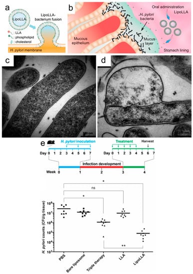 (a) Fusion of fatty acid-loaded liposomes with bacterial cell membranes; (b) liposomal delivery to H. pylori-infected stomach lining; TEM micrographs of (c) control and (d) LipoLLA-treated H. pylori bacteria; (e) bacterial load of H. pylori in mouse stomach after treatment with different therapeutic agents. * p < 0.05, ** p < 0.001. Reproduced with permission from Refs. [64,66].