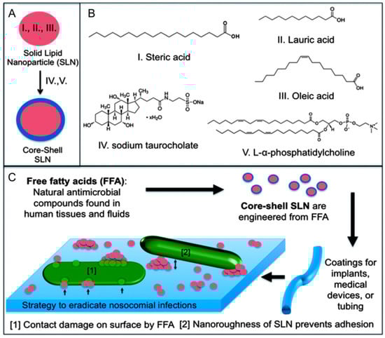 (A) Core-shell solid lipid nanoparticles are prepared which contain antimicrobial free fatty acids; (B) Lauric acid and oleic acid are antimicrobial lipids which are encapsulated in the inner core; (C) Deposited SLNs on the tube surface inhibit bacterial adhesion and damage bacteria. Reproduced with permission from Reference [72].