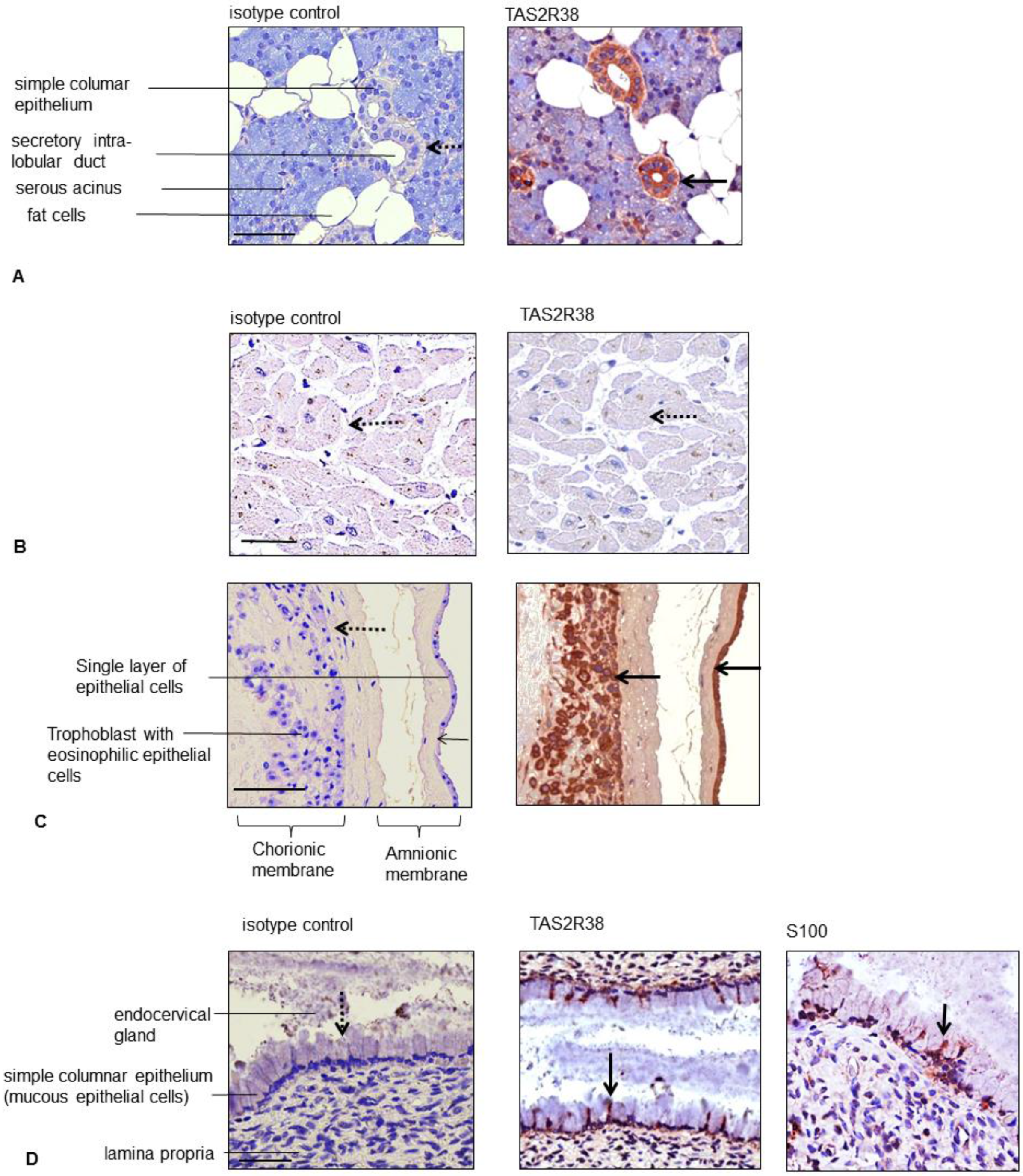 Staining of human tissues of the human tissue microarray against TAS2R38. Parotid gland (A); heart (B); human placenta (chorionic plate) (C) and endocervix (D) were stained with an isotype control antibody or an antibody against TAS2R38 and S100 (only the endocervix). Arrows in bold indicate positively and dashed arrows negatively stained cells; the bars correspond to 50 µm.