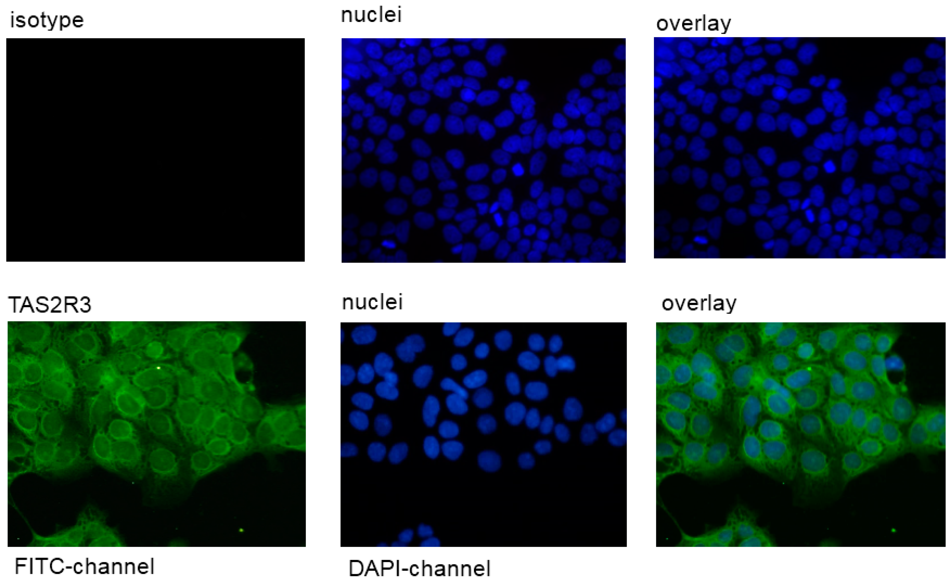 To perform TAS2R38 labeling, the cells were stained with the polyclonal rabbit anti-human TAS2R38 antibody. The required secondary antibody (swine anti-rabbit-FITC antibody) was applied for 2 h at RT according to the manufacturer's instructions. The cells were then stained with DAPI and mounted in fluorescence mounting medium (Dako). Images were taken with a fluorescence microscope (Zeiss) equipped with the Axiovision software.