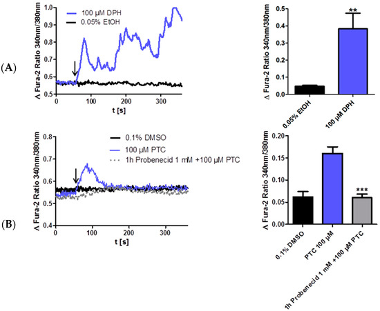 DPH and PTC induce calcium influx in JEG-3 cells. (A) JEG-3 cells are stimulated after 60 s with DPH (100 µM) or DMSO (0.1%) as indicated with the arrow and calcium currents are analyzed by calcium imaging. Calcium influx is expressed as the difference of the fura-2 ratio before and after stimulation; (B) JEG-3 cells are stimulated after 60 s with PTC (100 µM) or DMSO (0.1%) as indicated with the arrow. Calcium currents are analyzed by calcium imaging. Calcium influx is expressed as the difference of the fura-2 ratio before and after stimulation. 1 h pre-incubation with probenecid (1 mM) reduces PTC-induced calcium currents to solvent level. Data + SEM. n = 5. t-test, unpaired, two-tailed. ** p < 0.01, *** p < 0.001.