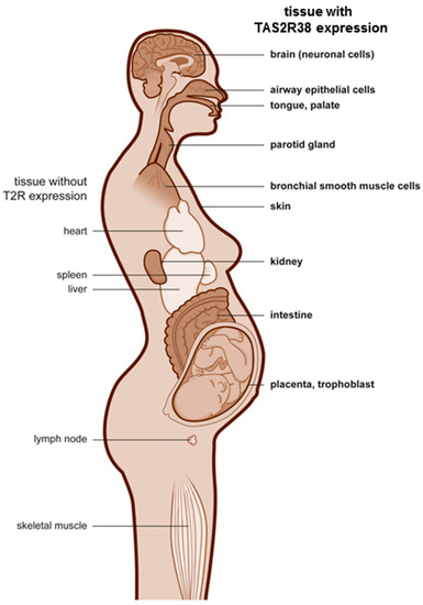 TAS2R38 expressing human tissues. The cartoon highlights organs that express TAS2R38 in the human organism in bold on the right site, and organs that are negative for TAS2R38 on the left site.