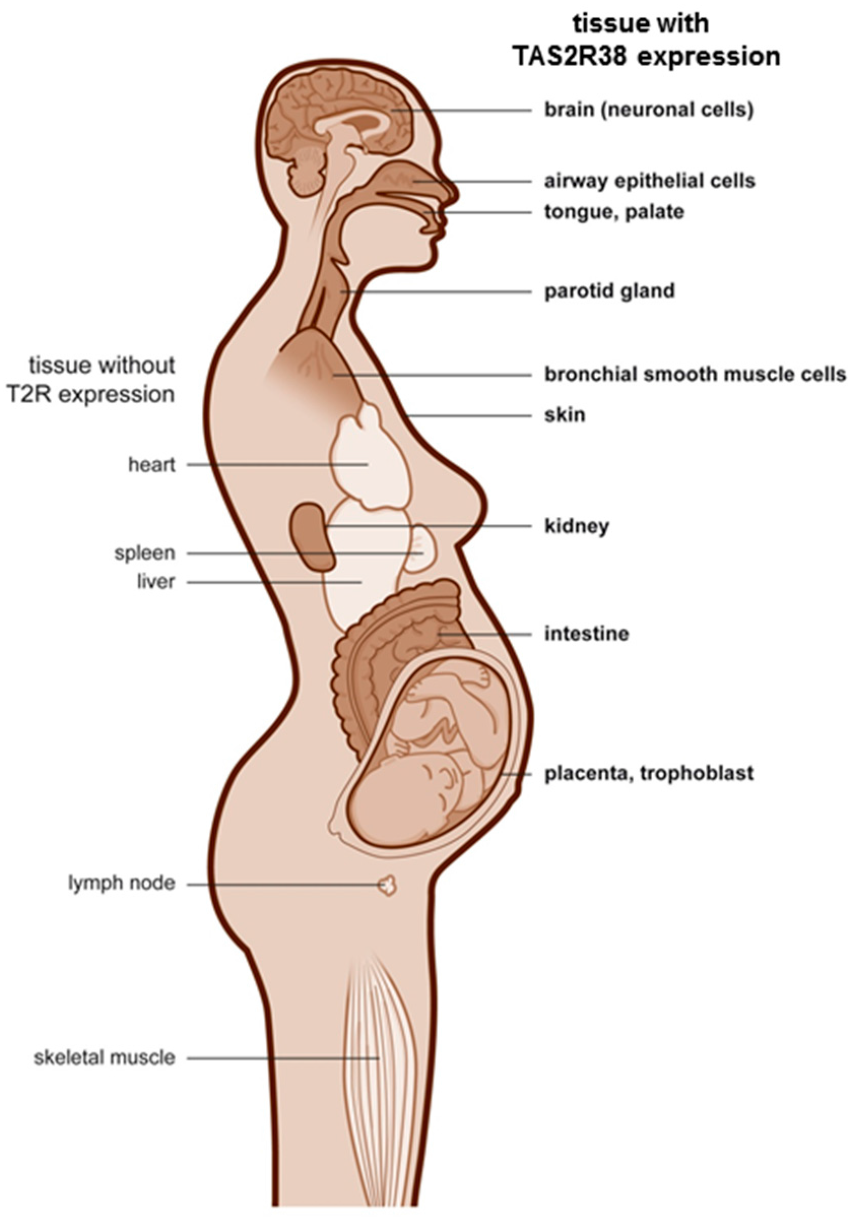It can be speculated that structures that protect the embryo express TAS2R38 whereas some mesodermal structures such as the lymphatic system, blood, the heart, and skeletal muscle are negative. Furthermore TAS2R38 expressing cells in the placenta might be chemosensors which control hormone secretion in analogy to the enteroendocrine cells described in the gut [15]. The cartoon in Figure 4 highlights organs that express TAS2R38 in bold on the right site.