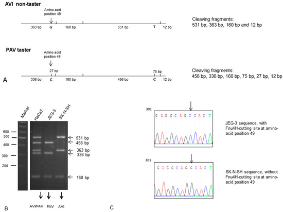 4.3. Restriction Enzyme-Based Detection of the TAS2R38 Gene Allele to Distinguish between PTC Taster and Non-Taster