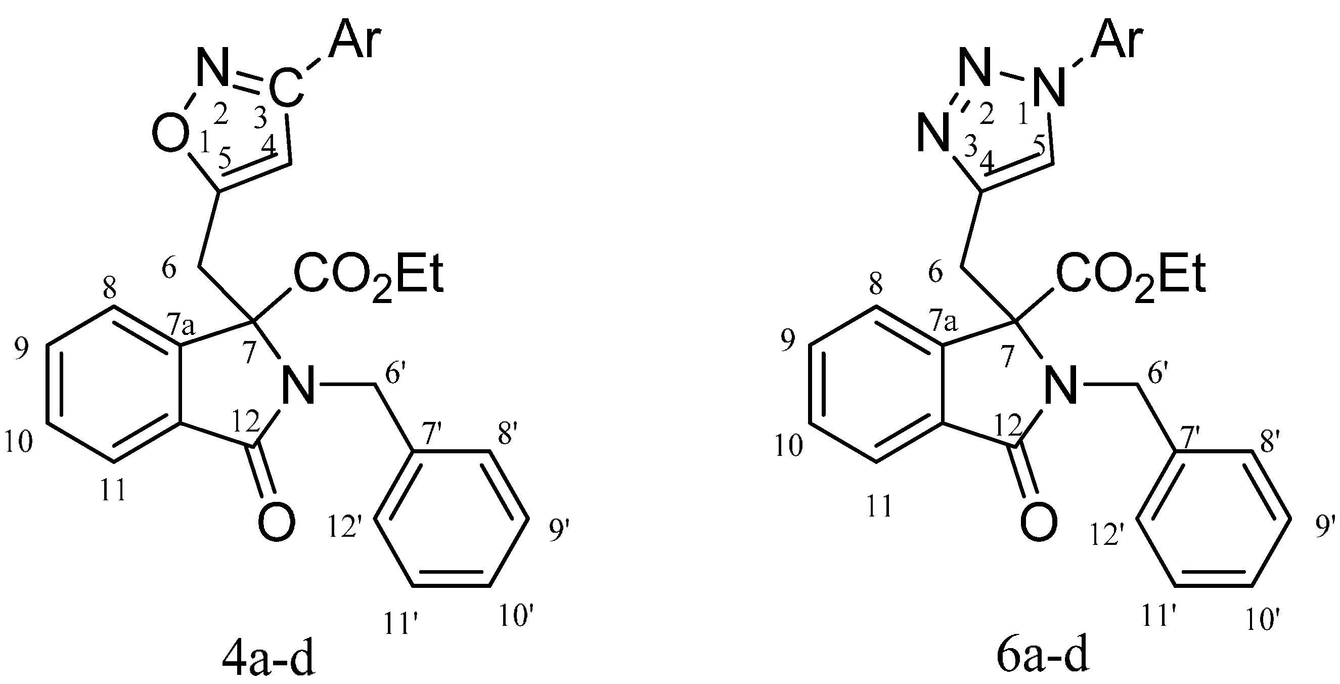 3.2. Typical Procedure of the Cycloaddition Reaction of Arylnitrile Oxides 1a–d and Ethyl-3-alkyldiynyl-phtalimidine-3-carboxylate (3)