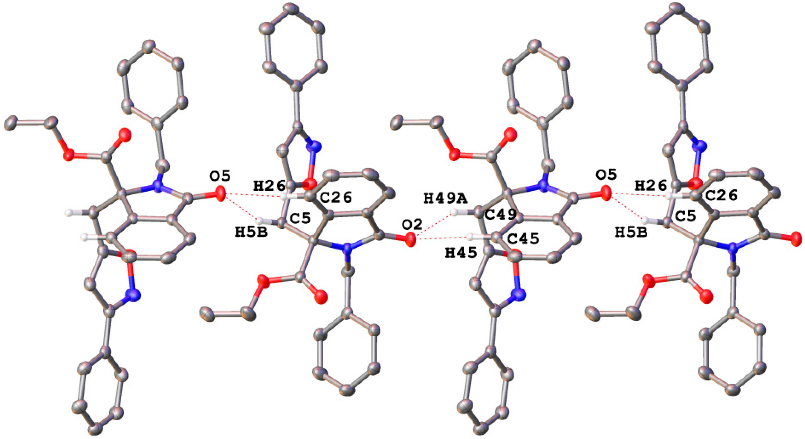 - Crystal data for compound 4a C28H24N2O4 (115 K): Monoclinic, P21/c, a = 14.149(4), b = 17.091(3), c = 23.576(8) Å, β = 126.741(18)°, λ = 0.71073 Å, V = 4569(2) Å3, Z = 8, Dc = 1.316 Mg/m3.
