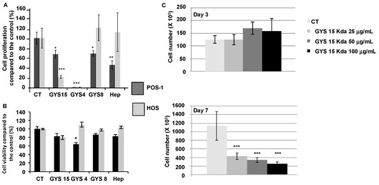 Comparison of the effects of OS-EPS derivatives with various molecular weights on two osteosarcoma cell lines, the mouse POS-1 and human HOS: (A) proliferation of both cell lines after seven days of treatment; (B) cell viability assessment of HOS and POS-1 cells after three days of treatment with or without OS-EPS derivative treatment; and (C) kinetic of biological activity of increasing doses of GYS15 on HOS cell proliferation. Proliferation assays were performed by cell counting with Trypan Blue to compare the cell proliferation rate between groups. OS-EPS 15 kDa (GYS15), OS-EPS 8 kDa (GYS8), OS-EPS 4 kDa (GYS4), heparin (Hep) and control (CT). * p < 0.05; ** p < 0.01; *** p < 0.001.
