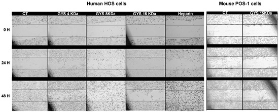 Migration of the human HOS cells and mouse POS-1 cells in the presence of various OS-EPS derivatives (300 µg/mL): OS-EPS 15 kDa (GYS15), OS-EPS 8 kDa (GYS8), OS-EPS 4 kDa (GYS4), heparin and control (CT). This experiment was repeated three times and a representative experiment is shown.