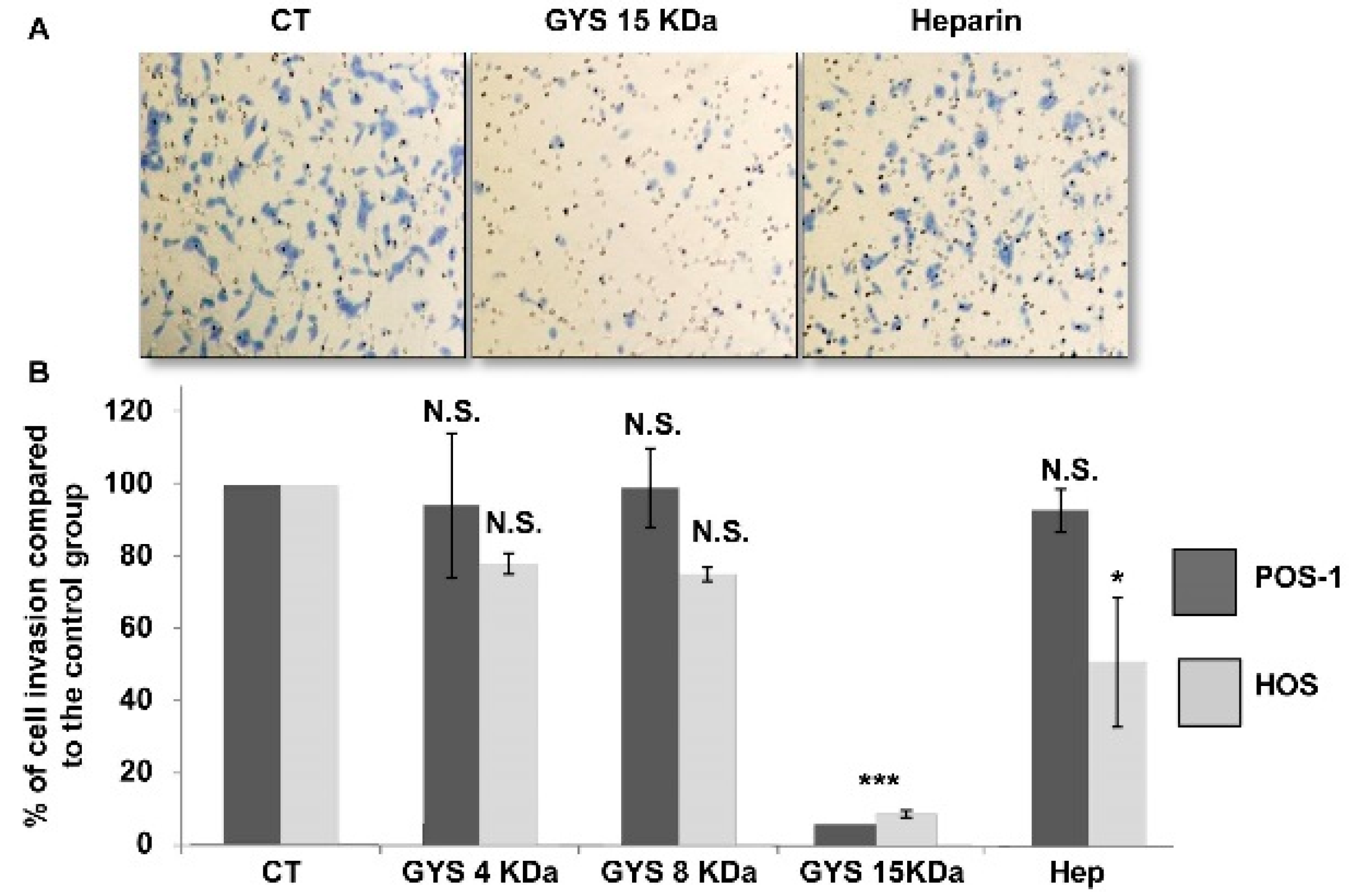 Invasion of the osteosarcoma cell lines, the mouse POS-1 and human HOS, in the presence of OS-EPS derivatives with various molecular weights: 25 µg/mL OS-EPS 15 kDa (GYS15), 50 µg/mL OS-EPS 8 kDa (GYS8), 50 µg/mL OS-EPS 4 kDa (GYS4), 50 µg/mL heparin (Hep) and control (CT). (A) Microscopic photographs of invasive HOS cells treated or not with of GYS15 or heparin; (B) Cells migrating through the Boyden’s chambers were counted in five microscopic fields using Image J software. N.S.: not statistically significant; * p < 0.05; *** p < 0.01.