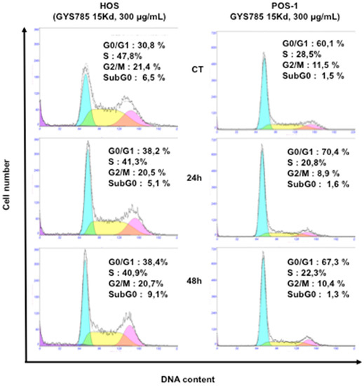 Effect of the OS-EPS 15 kDa derivative (300 µg/mL) on the cell cycle of osteosarcoma cell lines: cell cycle distribution of human HOS and mouse POS-1 cells were studied by flow cytometry after 24 h and 48 h treatment with OS-EPS derivatives. Experiments were repeated three times and a representative experiment is shown.