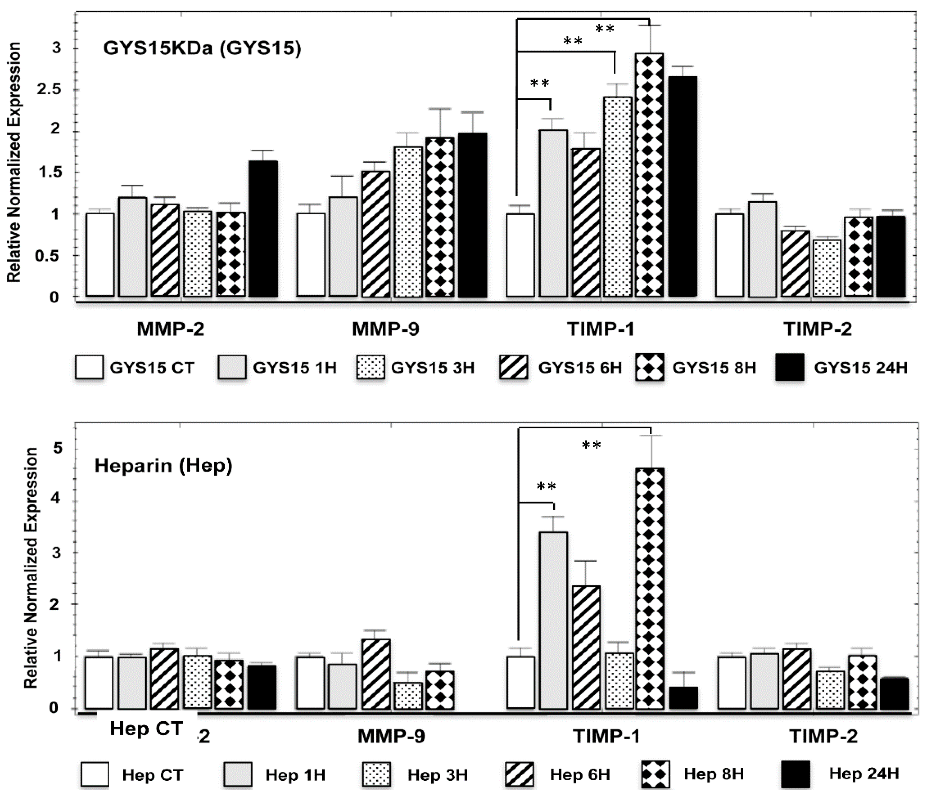 Effect of OS-EPS 15 kDa derivative on the expression of MMP-2 and MMP-9 and their inhibitors (TIMP-1 and TIMP-2, respectively) compared to heparin on human HOS cell line. The osteosarcoma cells were treated 1, 3, 6, 8 and 24 h with OS-EPS 15 kDa derivative or heparin at the concentration of 50 µg/mL or not (control). The cell expression of MMPs and their inhibitors in osteosarcoma cells was determined by RT-qPCR. ** p < 0.01.